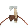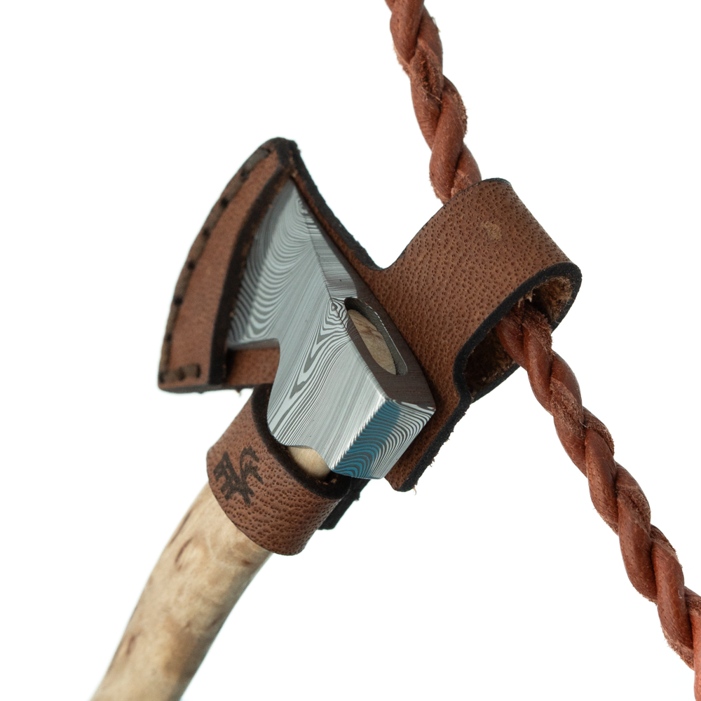 Observera att eftersom smyckesyxan är helt tillverkad för hand av utvalda stålbitar kan utseende och mönster variera från yxa till yxa - något som gör ditt exemplar helt unikt. Eggskyddet sitter fast på skaftet för att minska risken att den ramlar ur när den bärs som halsband. Yxan kan fortfarande användas.