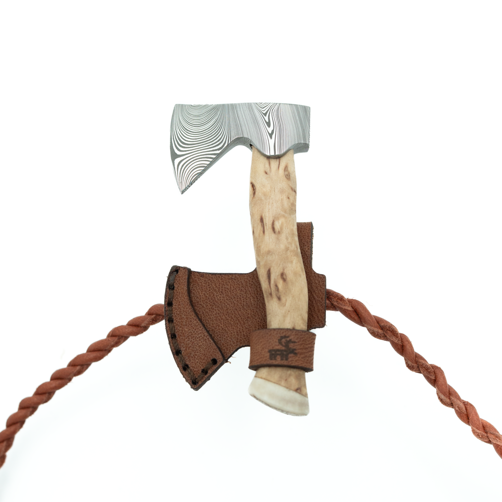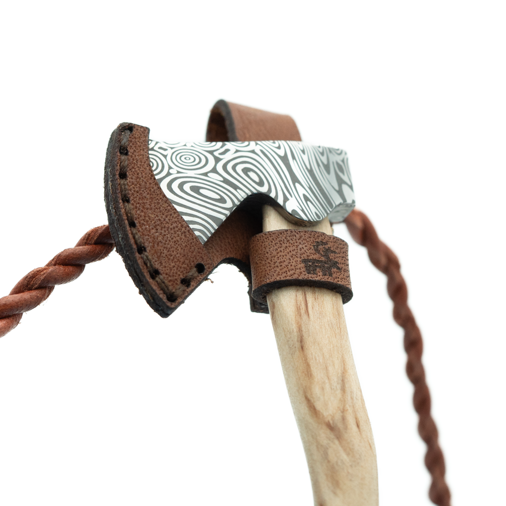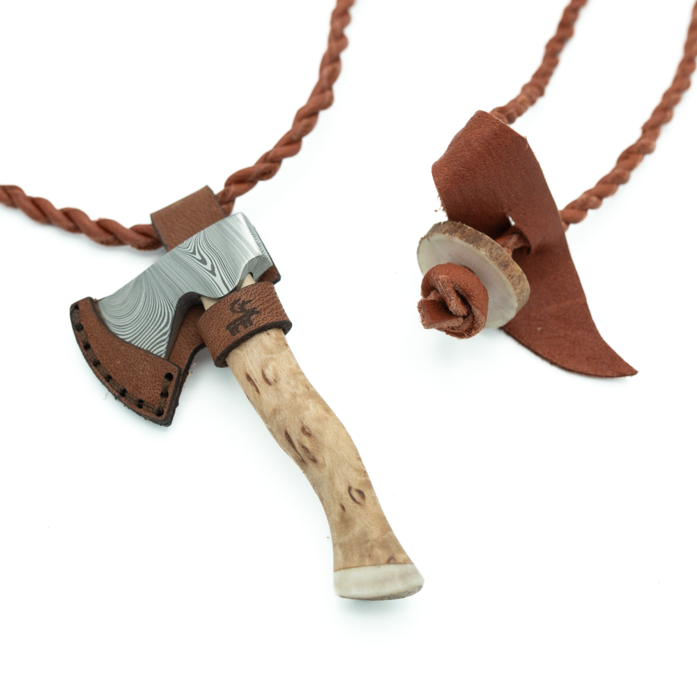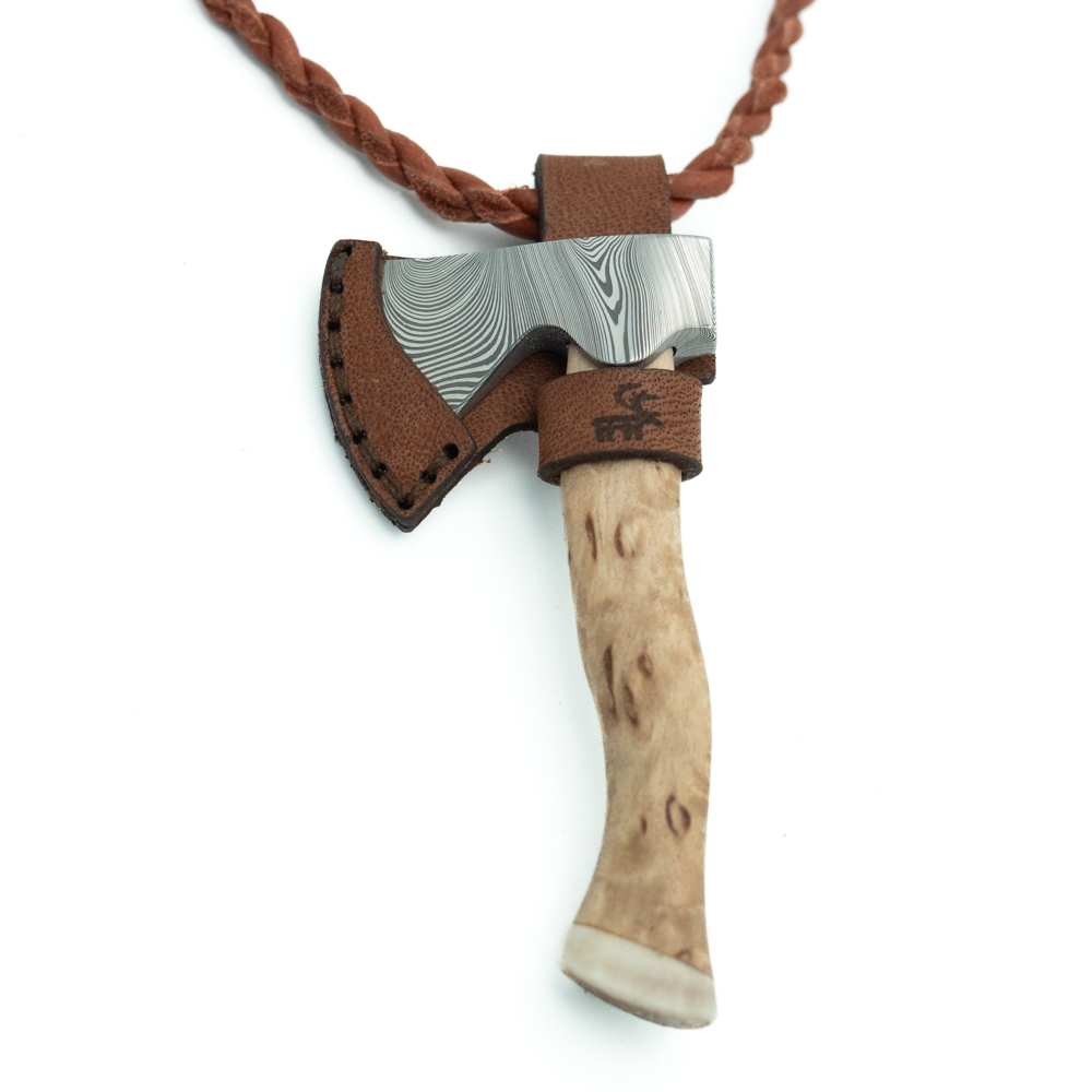 Formad efter våra eftertraktade Jaktyxor och döpt efter en av våra enastående knivmakare. Smyckesyxan har ett huvud av svenskt rostfritt damaskusstål, DS93X, från Damasteel®. Skaftet är tillverkat av masurbjörk med en älghornsbit i änden. Yxan sitter i ett handsytt eggskydd som hänger snyggt runt halsen med ett flätat läderhalsband av renskinn och en ände av renhorn.